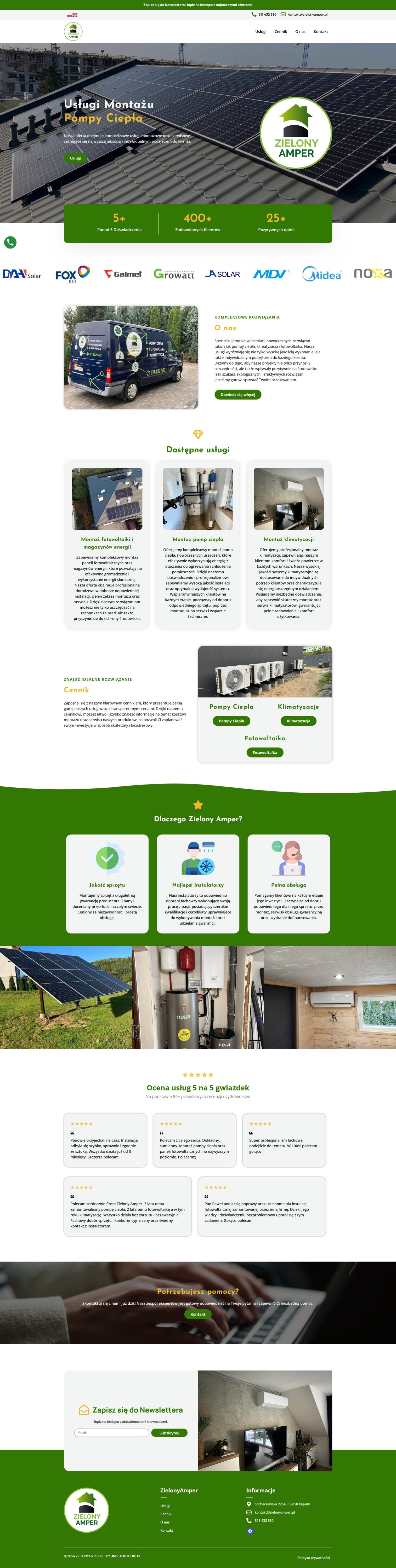 A professional website for a company specializing in the installation of modern ecological solutions, such as heat pumps, air conditioning, and photovoltaic systems. The site stands out with its clarity, highlighting the high quality of services and the individual approach to clients seeking efficient and eco-friendly solutions.