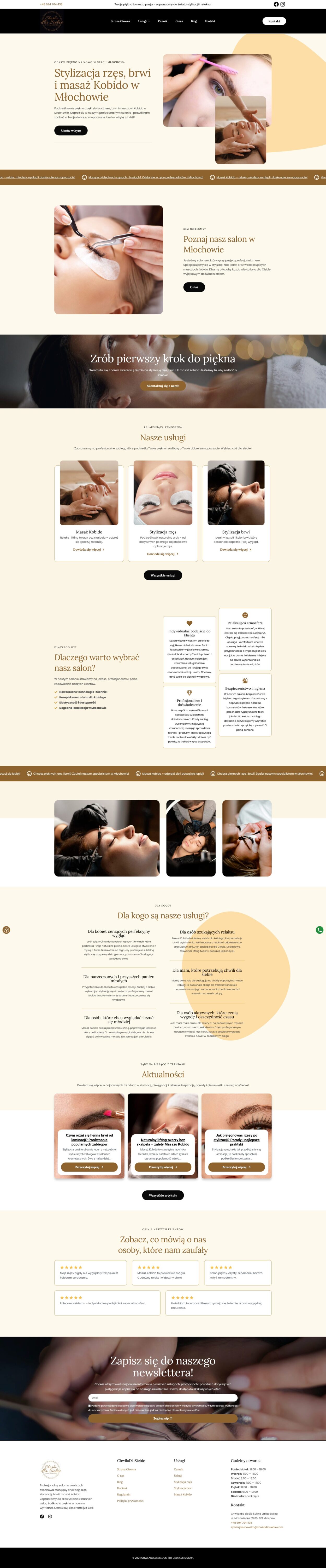 A website designed for a beauty salon in Młochów, specializing in eyelash and eyebrow styling as well as Kobido massage. The elegant and modern design emphasizes the high quality of services, while the clear structure makes it easy for users to explore the offer and book appointments online. It’s a place inviting relaxation and highlighting natural beauty.