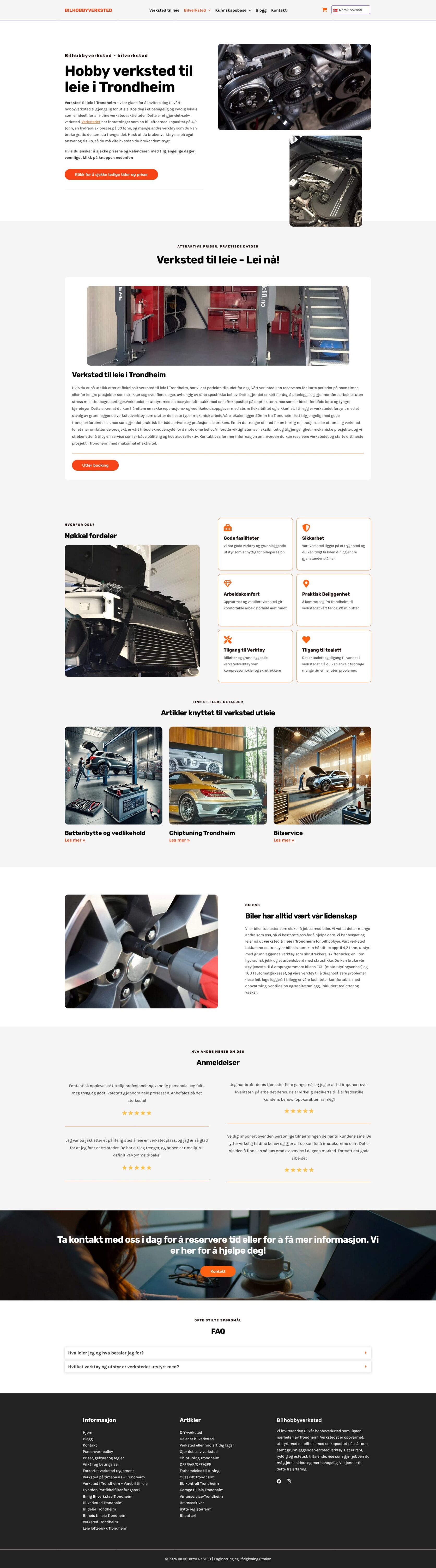 A website for a hobby workshop for rent in Trondheim. It offers a spacious, well-equipped workshop with tools such as a car lift and hydraulic press, available for those who want to work on their DIY projects. Users can check the workshop’s availability and prices to use this professional workspace.